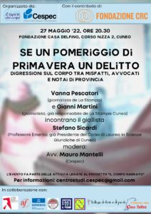 Spaziando tra i generi letterari, Il corpo narrato ha aperto i lavori partendo da un filone che analizza da un punto di vista particolare la corporeità: il genere giallo, in cui è spesso la scoperta di un corpo ad innescare il racconto. Il primo incontro, intitolato Se un pomeriggio di primavera un delitto, si è svolto il 27 maggio 2022 presso gli spazi di Fondazione Casa Delfino Onlus. L’evento ha visto come protagonista il giallista Stefano Sicardi, Professore Emerito, già Presidente del Corso di Laurea in Scienze Giuridiche di Cuneo, che ha dialogato con Vanna Pescatori, giornalista de La Stampa, Gianni Martini, giornalista, già responsabile de La Stampa Cuneo, e Mauro Mantelli, Consigliere del Cespec.