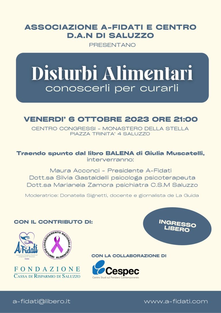 L’associazione A-Fidati (www.a-fidati.com) di Cuneo organizza un incontro di sensibilizzazione e approfondimento sul tema del disturbi alimentari, “Disturbi Alimentari conoscerli per curarli”, venerdì 6 ottobre alle ore 21:00 presso il Centro Congressi – Monastero della Stella a Saluzzo, piazza Trinità 4.