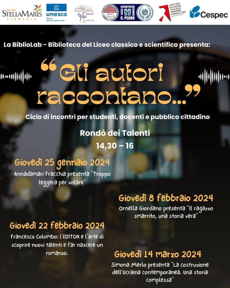 Anche quest’anno il Cespec ha collaborato con la Bibliolab del Liceo Classico e Scientifico “Pellico-Peano” per la realizzazione di una serie di incontri con autori di libri e non solo.