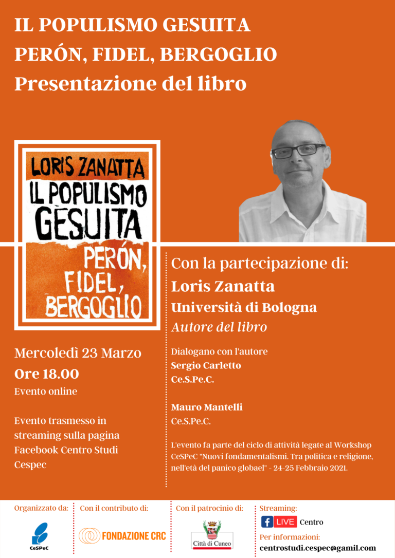 Martedì 23 marzo 2021 ore 18.00 in streaming, sulla pagina Facebook del Centro Studi Cespec presenteremo il libro IL POPULISMO GESUITA. PERÓN, FIDEL, BERGOGLIO, di Loris Zanatta (Università di Bologna). Dialogheranno con l’autore Sergio Carletto (CeSPeC) e Mauro Mantelli (CeSPeC).