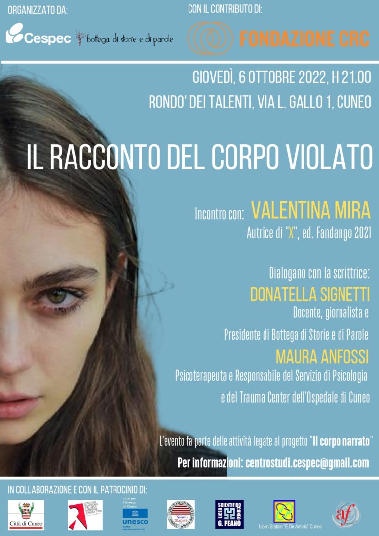 La scrittrice Valentina Mira, in occasione dell’incontro “Il racconto del corpo violato”, dialogherà con la psicoterapeuta Maura Anfossi e con Donatella Signetti, insegnante e presidente di Bottega di storie parole, a partire dal romanzo autobiografico “X” (Fandango 2021) la sera del 6 ottobre, alle 21 presso “Il rondò dei talenti”, in Via Luigi Gallo 1, e la mattinata del 7 ottobre con gli studenti della scuola secondaria, presso la Sala Einaudi della provincia alle ore 11. Sono due incontri volti all’educazione sentimentale e sessuale dei ragazzi, dei giovani e degli adulti a partire dal confronto con la letteratura contemporanea. Le attività di lettura e di riflessione sono già iniziate a giugno, con il supporto degli educatori/trici della Cooperativa Momo per gli studenti dei licei cuneesi, secondo un progetto intitolato “Il corpo narrato”, che vuol esser l’integrazione della prospettiva letteraria nella progettazione triennale sulla corporeità della Scuola di alta specializzazione del Cespec di settembre. Il Centro Studi del Pensiero Contemporaneo in collaborazione con la Bottega di Storie e Parole, ha scelto ora, dopo la presentazione in maggio dei gialli del prof. Stefano Siccardi, presso la Fondazione Casa Delfino, un libro che racconta esperienze vissute in prima persona dall’autrice stessa. Dichiara la Presidente Angela Michelis: “Questo romanzo ci pone di fronte alla possibile realtà che tutte/i possiamo incontrare, ma anche su ciò che è da evitare. E proprio la complessità, e talvolta la contraddittorietà dei sentimenti e della sessualità, richiede di percorrere anche la via negativa, ovvero quella che ci indica ciò che è da evitare, per poi trovare delle risposte etiche, dei percorsi che educhino a rispettare le scelte delle persone e rendano più armonicamente vivibili le comunità, piccole o grandi che siano. Ringrazio per l’ideazione e la realizzazione in particolare Flora Geerts, Elisa Michelis e Donatella Signetti, oltre a tutte le istituzioni e associazioni che ci sostengono in differenti modi”.