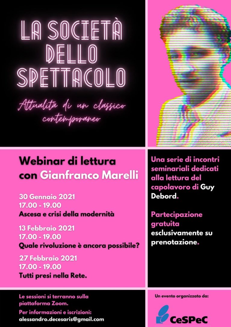 Sabato 30 Gennaio ore 17.00 il primo incontro del webinar di lettura con Gianfranco Marelli su Guy Debord e la Società dello spettacolo. Parleremo di Ascesa e crisi della modernità con Gianfranco Marelli e Raffaele Alberto Ventura.