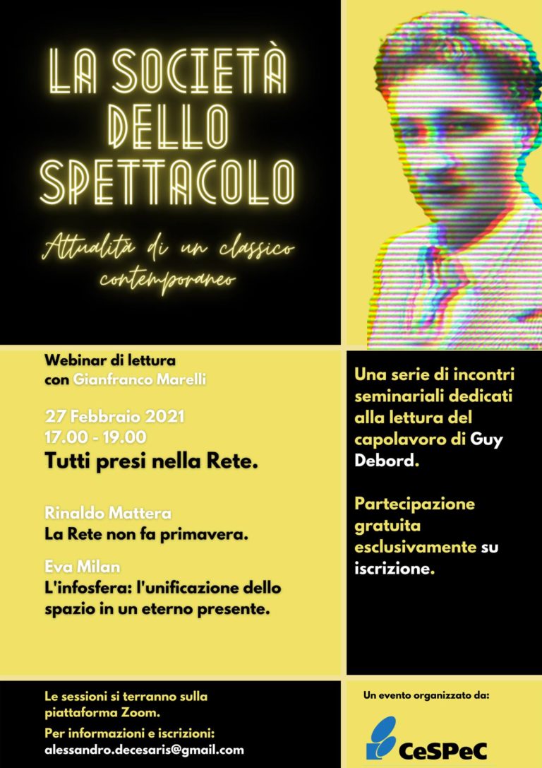 Sabato 27 Febbraio ultimo incontro seminariale dedicato alla lettura de La società dello spettacolo di Guy Debord. Saranno con noi Gianfranco Marelli, Rinaldo Mattera e Eva Milan.