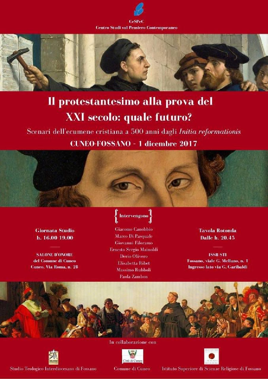 Venerdì 1° dicembre a Cuneo e Fossano si svolgerà il workshop intitolato “Il protestantesimo alla prova del XXI secolo: quale futuro? Scenari dell’ecumene cristiana a 500 anni dagli Initia reformationis”. Il convegno, organizzato dal CeSPeC (Centro Studi sul Pensiero Contemporaneo) di Cuneo si svolgerà nel pomeriggio, a partire dalle ore 16:00, presso il Salone d'Onore…