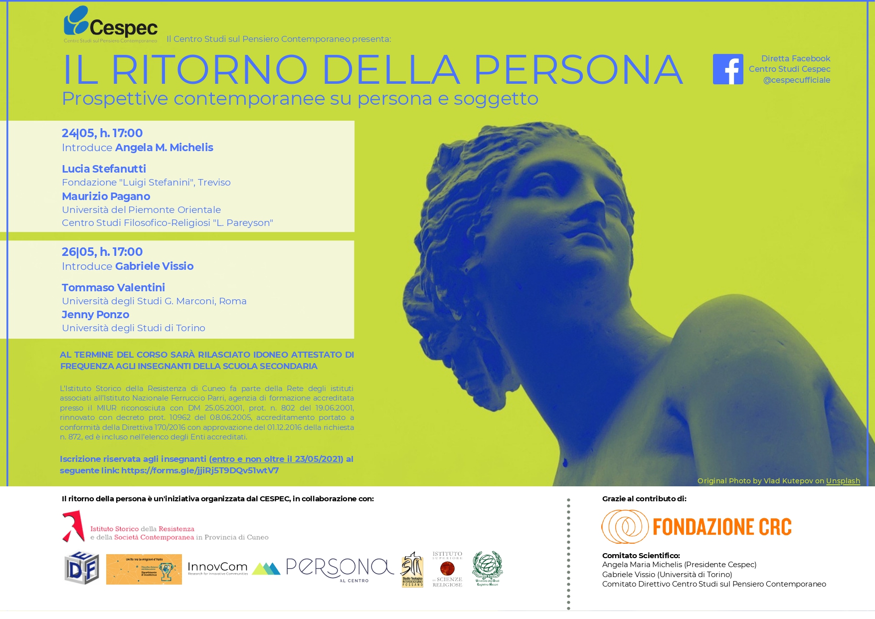 Il Workshop online “Il ritorno della persona. Prospettive contemporanee su persona e soggetto” si tiene lunedì 24 e mercoledì 26 maggio, a partire dalle ore 17.00 in diretta Facebook, sulla Pagina del Centro Studi Cespec. Lunedì 24 introduce la presidente del Cespec, Angela Michelis. Intervengono Lucia Stefanutti (Presidente della Fondazione Luigi Stefanini – Treviso) e…